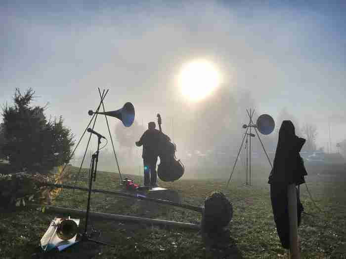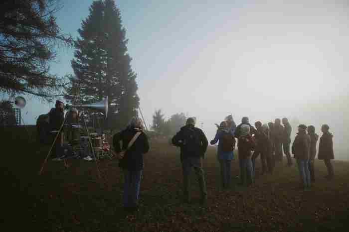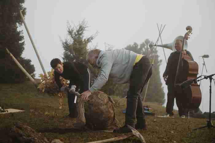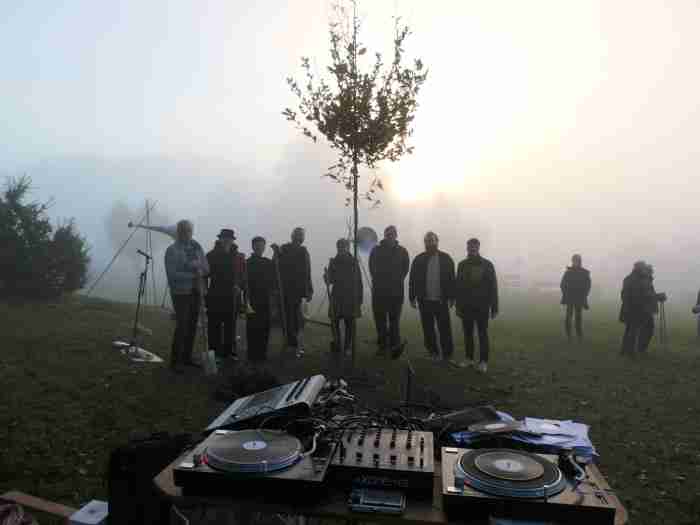 2124 kommt es dann zur Durchführung. Die Musiker:innen, die Gärtner:innen und das Publikum von 2024 sind tot. Einzig der Baum steht noch am gleichen Ort und scheint aus einer anderen Zeit zu erzählen. Die 5 Lautsprecher, welche in der Kantonsbibliothek AR eingelagert waren, werden exakt am gleichen Platz wie vor 100 Jahren aufgebaut. 5 DJs spielen die A – Seiten der 5 Vinyl- Platten aus der Phonoteca Nationale. DJ 1 beginnt mit den Aufnahmen der Gärtner:innen – DJs 2-5 kommen gemäss Partitur später dazu. Das Tonmaterial der Exposition wird nun neu gemischt und interpretiert und wird zur Durchführung. Später erscheinen zwei Gärtner:innen und beginnen den Baum zu fällen. Kurz vor dem Umfallen gibt es eine Generalpause der 5 DJs. Als Solo – Kadenz fällt der Baum tossend auf den Boden. Sobald er gefällt ist, spielen die 5 DJs unisono die B- Seite ihrer Platten. Das Publikum von 2024 applaudiert als sehr lange Coda, bis die Komposition als fade out endet. Fine - Mit Applaus?
