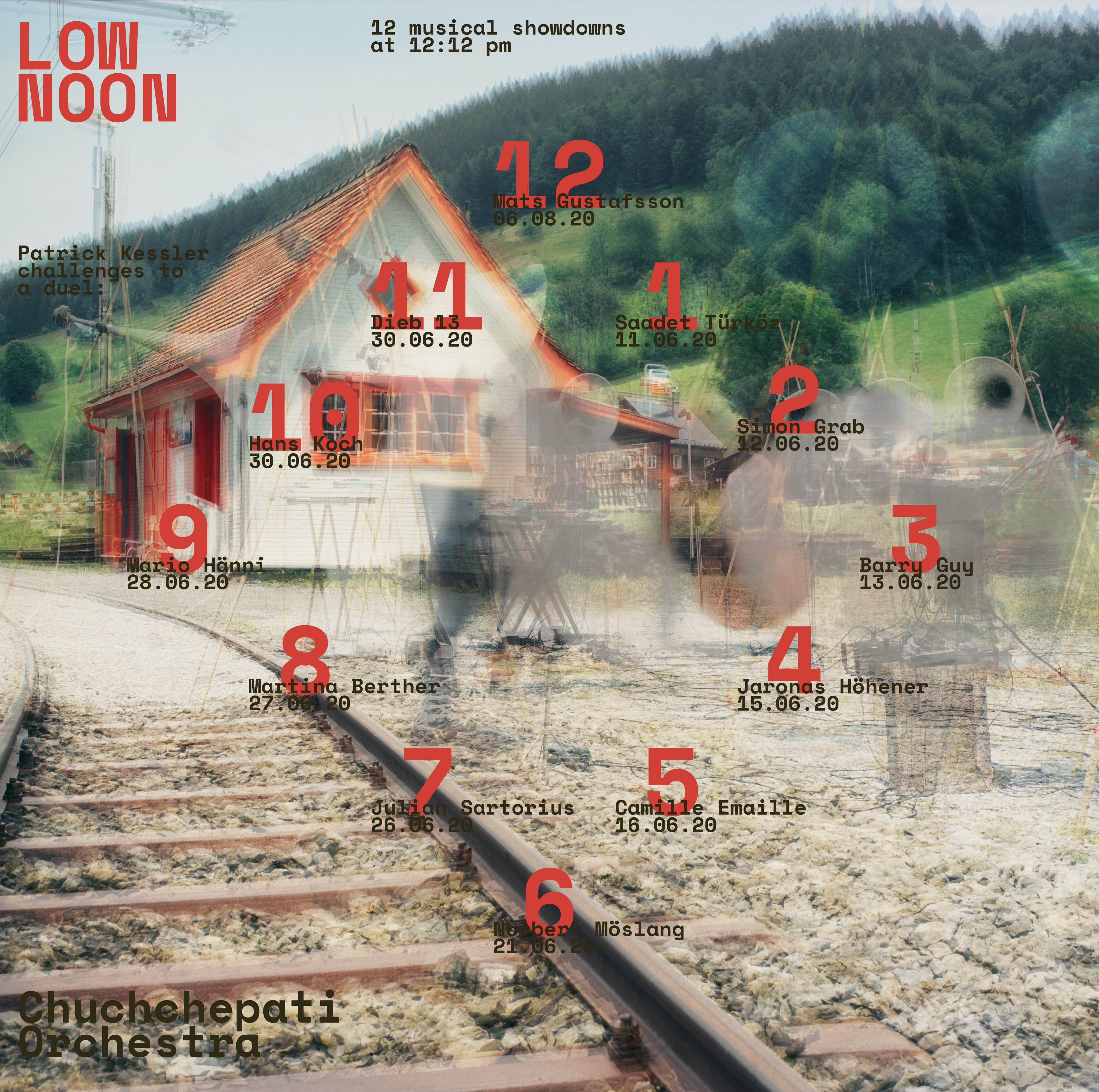 Ein Dutzend Musiker*innen aus dem Umfeld des Chuchchepati Orchestra liess sich 2020 von Patrick Kessler zu einer Begegnung auf Augenhöhe mittags um zwölf herausfordern. Die erste Serie von Konzerten fand im Juni 2020 statt. 2021 wird «Low Noon» in erweiterter Form fortgesetzt: Nun können sowohl Duos wie grössere Formationen zum Duell anreisen, und die Showdowns sollen auch an anderen Orten ohne Bahnhof stattfinden. Gleich bleibt der enge zeitliche Fahrplan. Pünktlich nach 12 Minuten ist der einfahrende Zug zu hören, wenn auch nur als Sound-Konserve aus den Lautsprechern, die Musik verklingt. Die nächste Konstellation macht sich bereit...