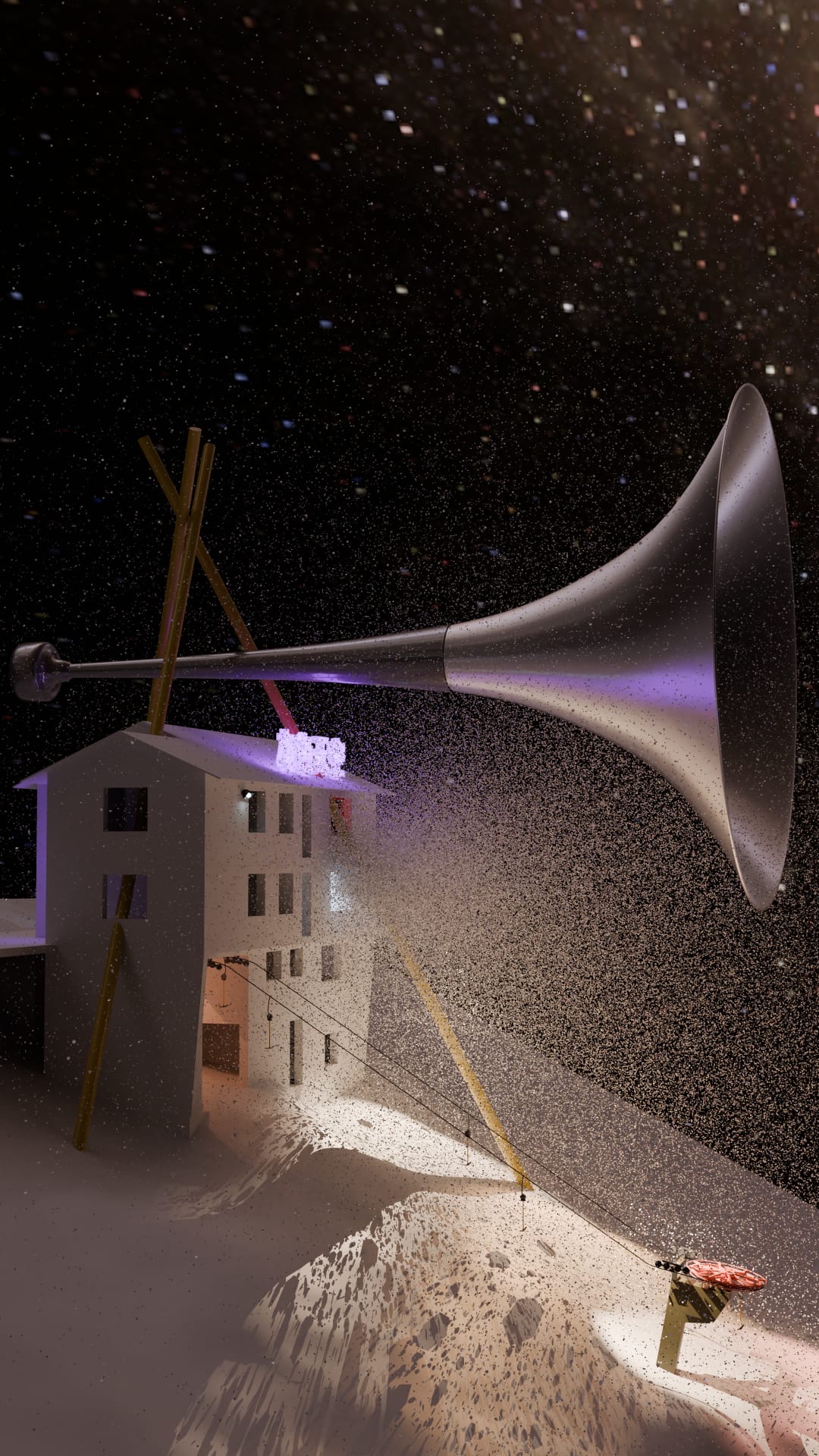 1 Skilift mit fünf Bügeln, 2 Microphone, 2 Tonabnehmer, 2 Lautsprecher, analoger Mixer
