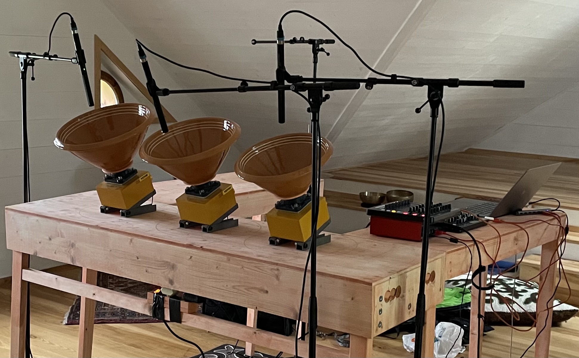 Unlike in traditional performance practice, the Talerbecken in this work rotate mechanically. By spinning up to three prepared clay bowls simultaneously, they expand the classic drone into polyphony — while also layering various rhythms. These analog looping machines are powered by motors specifically developed for the project by Manuel Balzarek from the Kunstgiesserei St.Gallen.